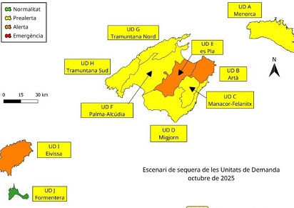 No se han producido cambios de escenario respecto al mes anterior. Así, solo una unidad de demanda (Formentera) se mantiene dentro del escenario de normalidad, seis unidades (Menorca, Manacor-Felanitx, Migjorn, Palma-Alcúdia, Tramuntana Norte y Tramuntana Sur) se encuentran dentro del escenario de prealerta, y tres (Es Pla, Artà y Eivissa) permanecen en alerta.