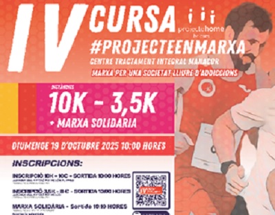 LA 4ª CARRERA SOLIDARIA #PROJECTEENMARXA TENDRÁ LUGAR EN MANACOR EL DOMINGO 19 DE OCTUBRE Y SALDRÁ DESDE LA PLAZA DE "SA MOLADORA". El domingo 19 de octubre, Manacor se convertirá en el escenario de la 4ª Carrera Solidaria a beneficio de Proyecto Hombre Baleares, entidad que hace cinco años que abrió el Centro de Tratamiento Integral de Manacor para la prevención, tratamiento, investigación y formación en el ámbito de las adicciones.